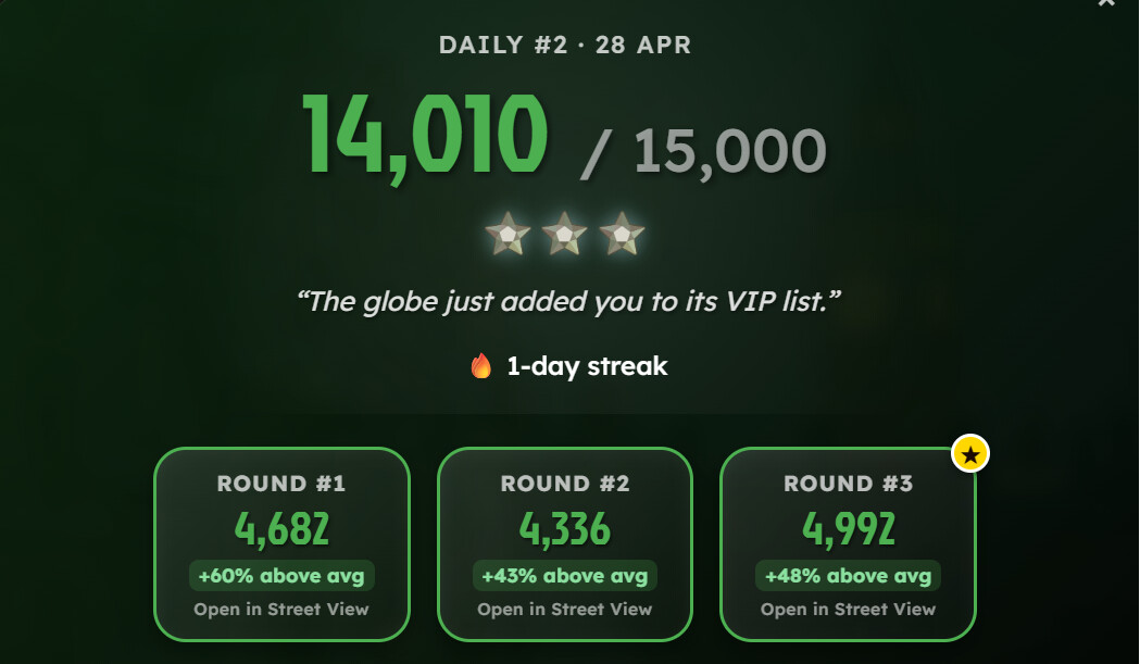 My WorldGuessr Daily Score · 28 Apr 14010 / 15000 · Beat 96% players worldwide