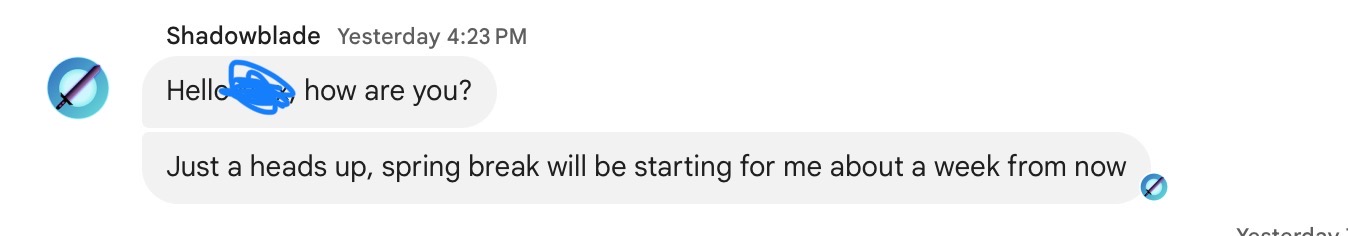 Edit (1/4/2025): Trying to make this subtle instead of making a reply about it and notifying everyone. I wonder who will find this first. My winter break’s coming to an end, so I will be gone for a while again. As last time, it was nice dropping by! I will see you all again some time in the spring. Take care, always feel free to DM me on Discord if any of you ever need anything